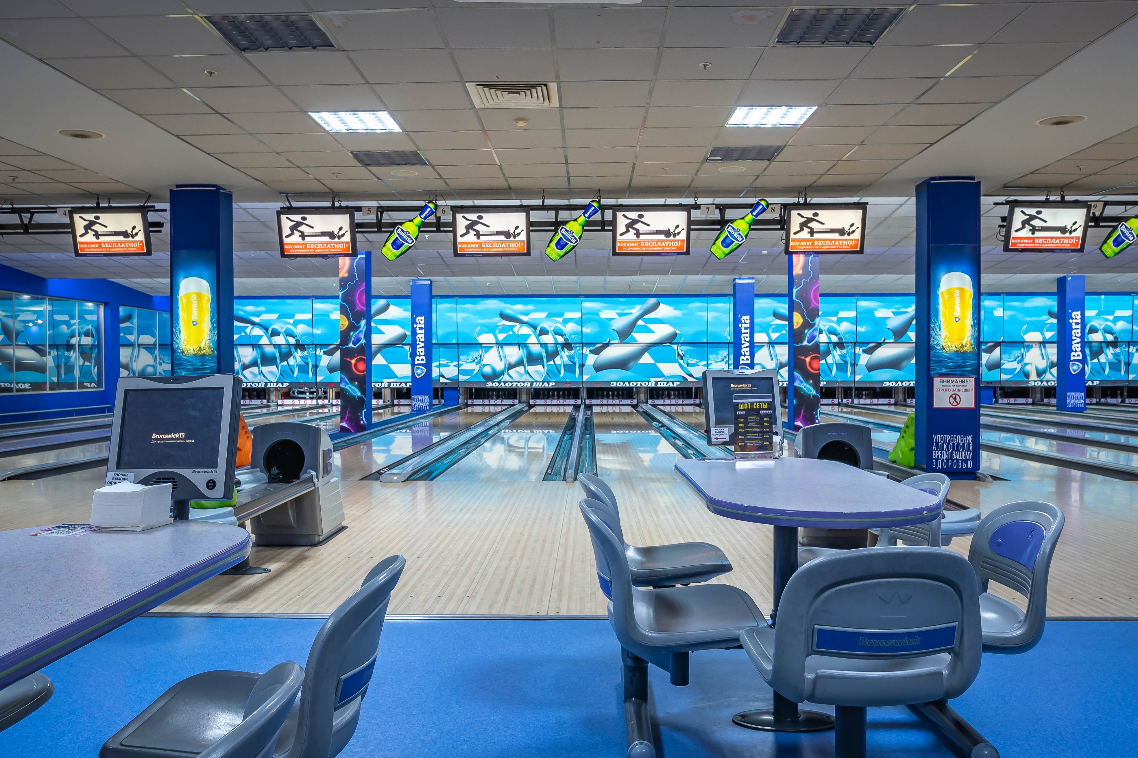 Я в этом клубе получаю удовольствие, здесь хорошие дорожки, удобная видимость и приятная обстановка. Ещё очень нравится, что дорожки подсвечиваются каждая своим цветом. Обслуживание тоже радует, быстро приносят заказ, очень понравилась пицца.